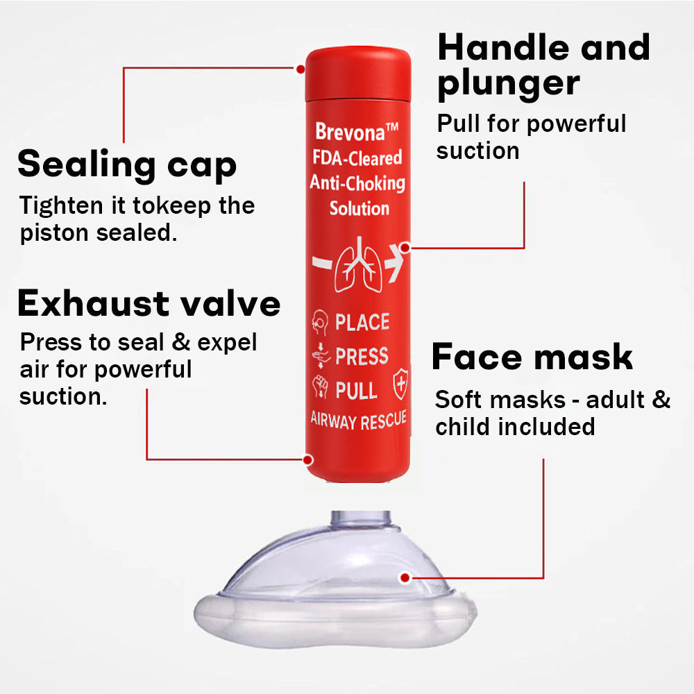 Brevona™ uses a simple but life-saving technology called negative pressure suction. Unlike the Heimlich maneuver, which requires physical force and can cause broken ribs or injuries, Brevona™ is non-invasive, safe, and easy to use.
